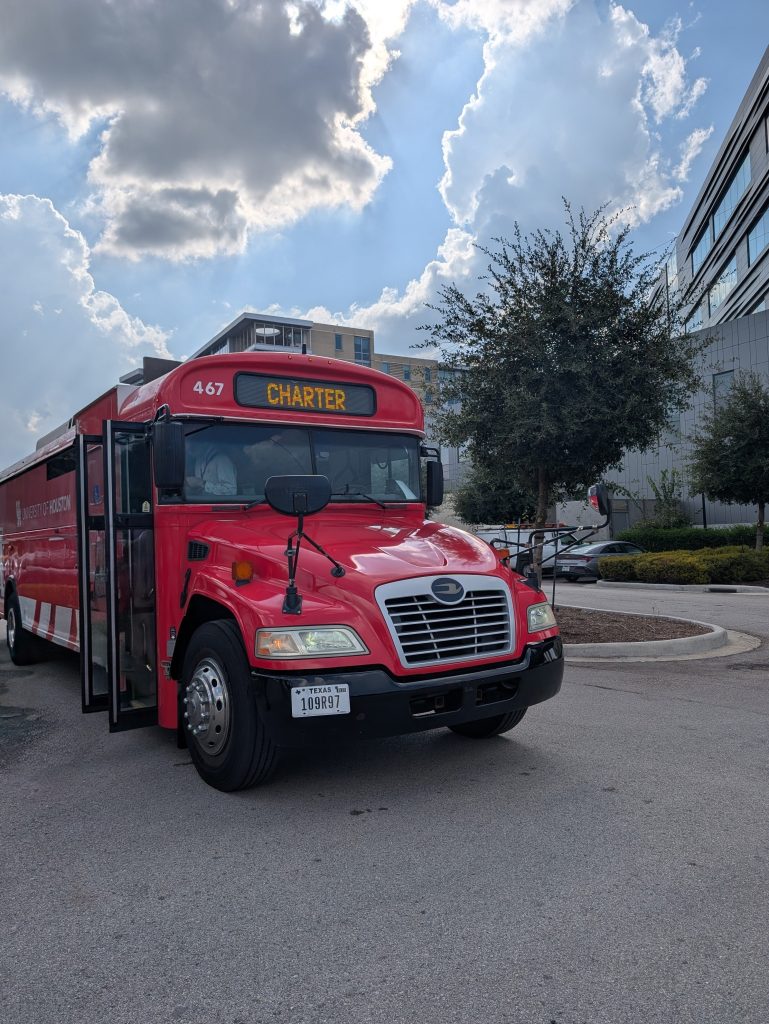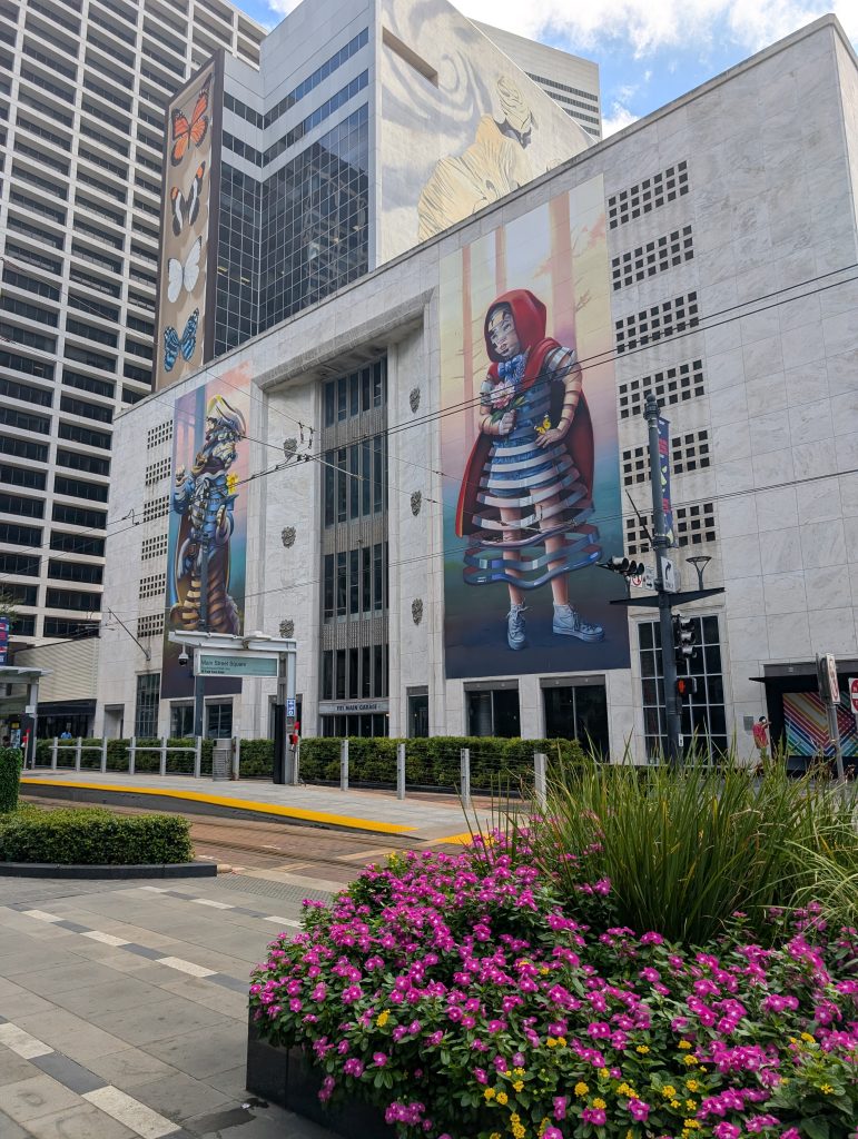 Left: Mr. Super A, “Little Red Riding Hood”—one of the many amazing murals dotted around the city. Right: University of Houston Law Center tour charter bus. Photos by Katie Lang and used with her permission.